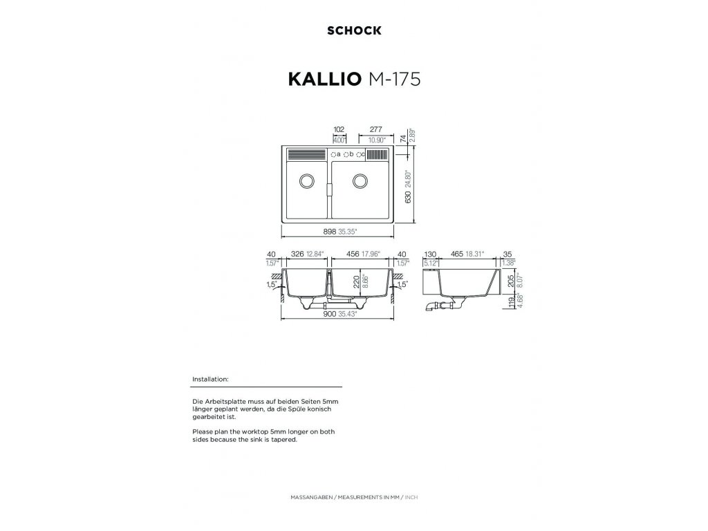 Upozornění: Pracovní deska musí být při montáži modelu Kallio M-175 o 5 mm delší, protože dřez má kuželovitý tvar.