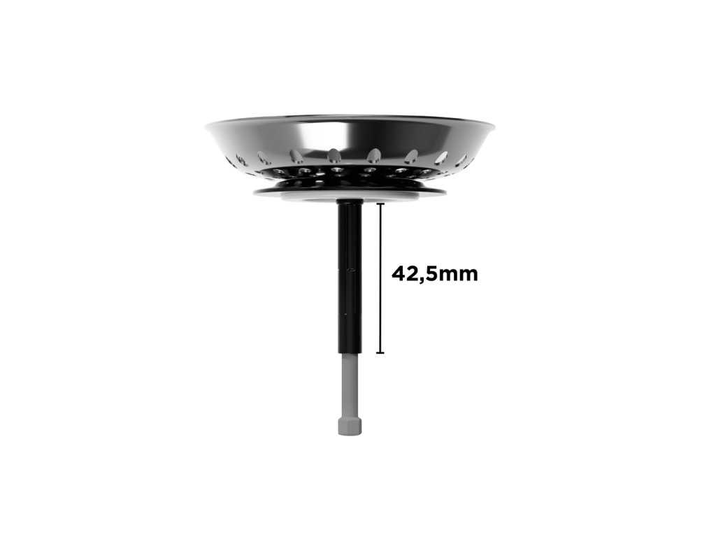 Nerezové sítko odtoku ovládané excentrem. Otočením ovládacím knoflíkem spustíte sítko, které uzavře odtok vody z dřezu. Zpětným otočením sítko stoupne nahoru a voda opět odtéká. Ve spodní části je stavitelný šroub.